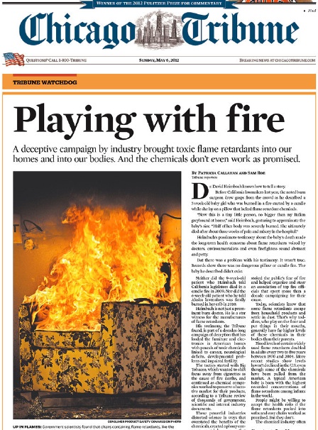 (San Francisco) The Chicago Tribune reported Sunday that corporations making flame retardants have spent millions of dollars on front groups, “pay for play” experts, and lobbying in order to defeat new restrictions on their hazardous chemicals, even when those laws were actively supported by fire fighters, scientists, and licensed public health professionals alike. The deceptive tactics of Albermarle, Chemtura, and Israel Chemicals Ltd are the reason that all furniture and baby products sold in California and across much of the US contain toxic and ineffective flame retardants. New York State passed a ban on TCEP flame retardant in 2011 and more recently the New York State Assembly unanimously passed a bill to ban the flame retardant TDCPP. That bill is now headed to the Environmental Conservation Committee in the Senate. “The industry shenanigans that the Tribune exposed have also been on display in New York,” said Bobbi Chase Wilding, Deputy Director with Clean and Healthy New York, which supports policy action on flame retardants. “The Chicago Tribune series should be required reading for the NYS Senate as they consider expanding a ban on these chemicals.” The Tribune investigation detailed the exploits of chemical industry front group, “Citizens for Fire Safety,” which purports to be a grass roots community group. “I am glad to see ‘Citizens for Fire Safety’ exposed as the ugly sham they truly are,” said Senator Sharon Nelson, Chair of the Senate Environment Committee in Washington state and sponsor of the Toxic Free Kids Act. “I am hopeful this will help raise awareness for real citizens about the dangers of these chemicals and help us get off the toxic treadmill once and for all.” “It’s hard to believe that we have levels of flame retardant chemicals- measured in pounds - similar to banned pesticides like DDT in our furniture that end up in our bodies, our pets, and wildlife. The only benefits are to the bottom line profits of the chemical producers,” said Arlene Blum, a chemist at UC Berkeley and Executive Director of the Green Science Policy Institute. “This article should help stop new flammability standards, currently being promoted by the industry, that are designed to sell chemicals rather than to increase fire safety.” Scientific research has linked exposure to retardant chemicals to lowered IQ, learning disabilities, infertility, other reproductive problems, and endocrine system irregularities. Because of industry supported flammability standards, retardant chemicals are added to many electronics, plastics, and polyurethane foam-containing goods like furniture, car seats, and crib liners. They escape from these products and build up in dust where people are exposed. Toddlers, who spend more time on the ground and have more hand to mouth behavior, have higher levels of retardant chemicals in their blood than adults. Among the global populations, babies born in America have the highest levels of these chemicals in their blood. "The chemical industry’s stranglehold over public policy must end,” said Pamela Miller, Executive Director with Alaska Community Action on Toxics, a group that supports policy to restrict retardant chemicals. On April 2, the Alaska State Senate passed legislation that would ban the use of polybrominated fire retardants (PBDEs) in mattresses, upholstered furniture and electronics. Dr. David Heimbach, the notorious witness whose fraudulent testimony was exposed by the Tribune’s Sunday expose, testified alongside another Citizens for Fire Safety representative. The bill was then sent to the Alaska House Labor and Commerce Committee where it languished when the legislature adjourned. “It is vital that we prevent the use of these toxic flame retardants at state and international levels because they are contaminating the global environment and harming public health,” said Miller. “They are widespread in the Arctic environment and found at high levels in the breast milk and blood of Arctic Indigenous women.” "Perhaps most disturbing to me, is the industry's use of people of color organizations to fight restrictions on flame retardant chemicals," said Mark Mitchell M.D., MPH, Co-Chair of the Environmental Health Task Force of the National Medical Association. The National Medical Association is the largest and oldest national organization representing African American physicians and their patients in the United States. "The science is abundantly clear that these chemicals are linked to health disorders that are of serious concern to ethnic communities and that these same communities are disproportionately exposed to flame retardant chemicals," said Dr. Mitchell. "It seems only a pattern of deceit and deception on the part of the chemical companies would lead people of color organizations to support their agenda." "The agenda of the chemical industry may be to protect profits over all else, but I am a nurse,” says Katie Huffling, RN, MS, CNM, from the Alliance of Nurses for Healthy Environments. “My priority is public health. And I can tell you children are not being protected from toxic chemicals. Otherwise, we wouldn't have burgeoning rates of childhood cancer, learning disabilities, juvenile diabetes, and other health problems.” “The flame retardant industry is so desperate to hold onto their profits from cancer-causing flame retardants that they use scare tactics and spend millions to keep peddling their poisons,"says Laurie Valeriano, Executive Director of the Washington Toxics Coalition, a group that worked to pass the first statewide ban on decaDE and supported a statewide ban on toxic tris flame retardants (TDCPP and TCEP) this year."In Washington State it was shocking that other companies like Johnson & Johnson, the Toy Industry Association, Wal-Mart, Target, and the Personal Care Products Council, teamed up with the chemical industry to do their bidding to oppose limits on these flame retardan